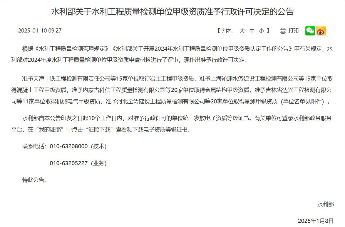 2025年1月10日,水利部網站發(fā)布公告,中騰智信正式取得水利工程質量檢測機構混凝土工程類、金屬結構類和量測類三項甲級資質。